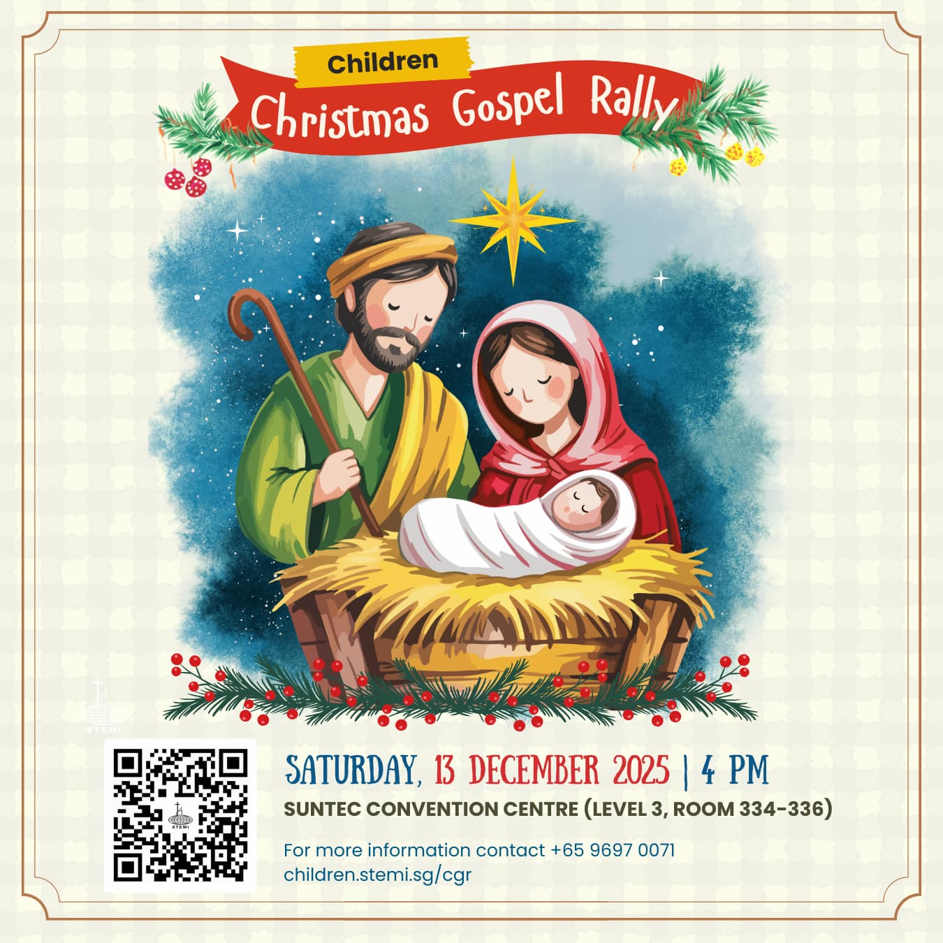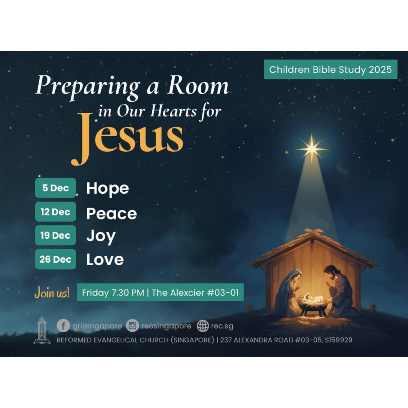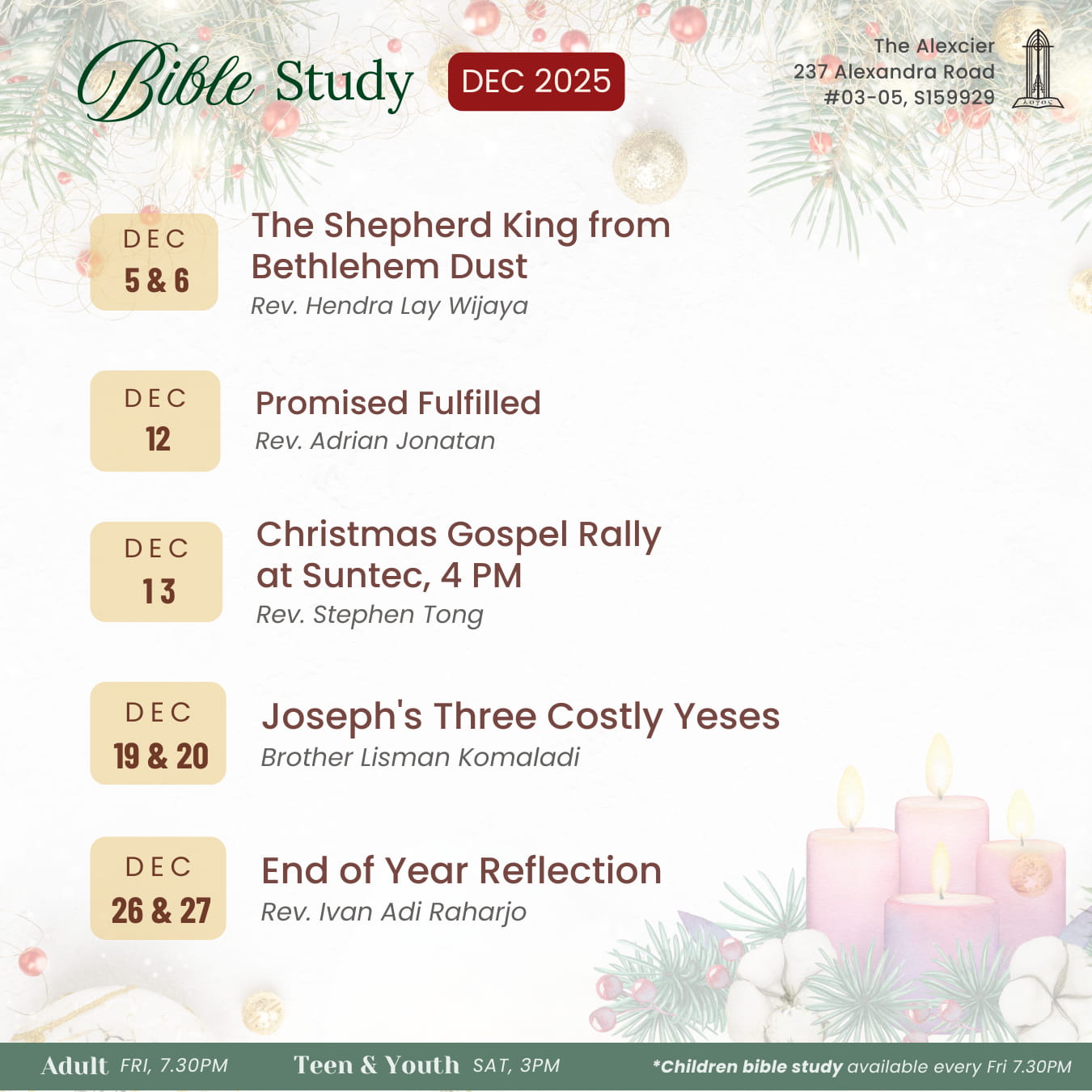 Kelas-kelas Sekolah Minggu diadakan bagi anak-anak berusia 2-12 tahun bersamaan dengan Ibadah Minggu Sore.